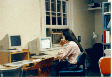 ![]() | Midway through my graduate student days, sitting in the astronomy department terminal room. The colors are off in this picture because it was in with a roll of film mostly consisting of night sky shots, and the photolab is incapable of setting the colors right for both day and night shots in the same roll. My opinion of the picture-taker is symbolized by my hand gesture. |