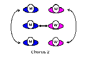Man 3 gives his right hand to woman 1, then continues the hey down the set, the others following. This differs from a normal hey however in that as soon as the men find themselves giving hands to their own partner, they then turn their partner into her place so that everyone ends up back in their original place in the dance. So this time through, Man 3 will hey with woman 1 and 2 then take his own partner by the hand and turn her into her place. Man 2 will hey with woman 1 then take his own partner by the hand and turn her into her place, and man 1 will only take hands with his own partner and turn her into her place. |
