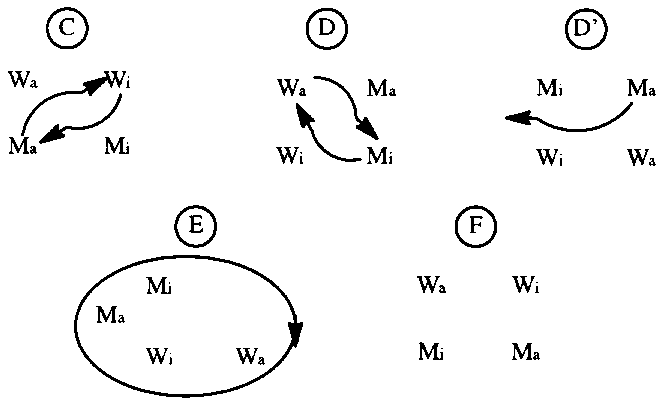 For this technique, the first crossover occurs as usual (C), and the second begins normally, but halfway through, the inactive man (Mi) takes the right hand of the active woman (Wa) with his left hand. Rather than moving into his normal spot, Mi walks in front of Ma, and places himself halfway between Ma and Wa, facing into the circle. This changes the role of the men and their partners. The kidnap is basically complete. The roles of the women do not change. In the circle (E), the men must take smaller steps to even out the circle and keep in time with the music. It is possible for the active man to foil the kidnap attempt. If the active man gently takes his partner's wrist or arm above the kidnapper's hand, the inactive man cannot pass. Do not fight for the woman. If the attempt fails, let it!