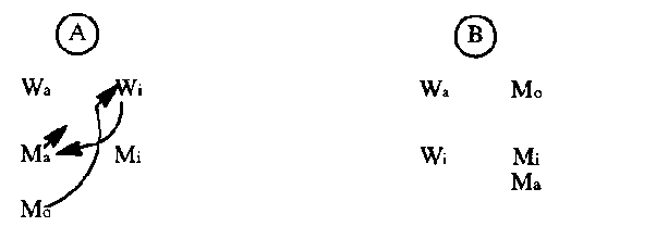 This technique works for kidnapping any position, active or inactive, male or female, but the diagram displays the role of the kidnapper (Mo) kidnapping out the active man (Ma). The idea is to step in front of your victim before he starts to cross over. Because timing is so crucial, it needs to be practiced before it is tried in a formal setting. If you do not successfully cut out your victim, abandon the move! This technique can easily be foiled.